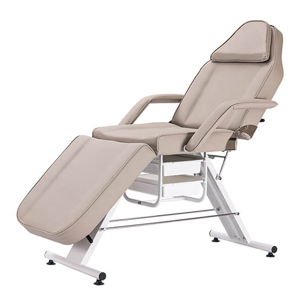 Upholstered in premium quality PU vinyl. High density foam for longevity and superior comfort. Removable arms and insert pillow. Face hole. Metal base with 2 slide out drawers.