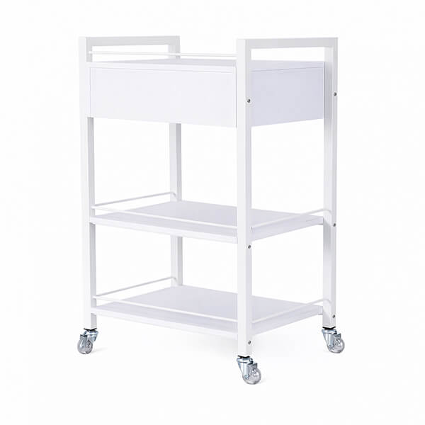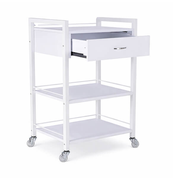 The Bella 1 Drawer Beauty Trolley in white features one large drawer and two shelves, providing ample storage space for all your beauty products and equipment. A hole can be drilled on the top of either armrest to attach your magnifying lamp. It includes two back-supportive pins on the lower shelves and professional roller wheels for easy mobility around the salon. Also available in white.