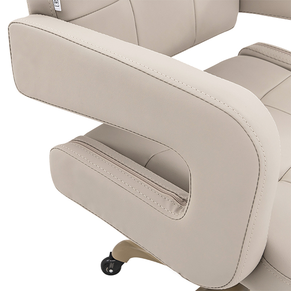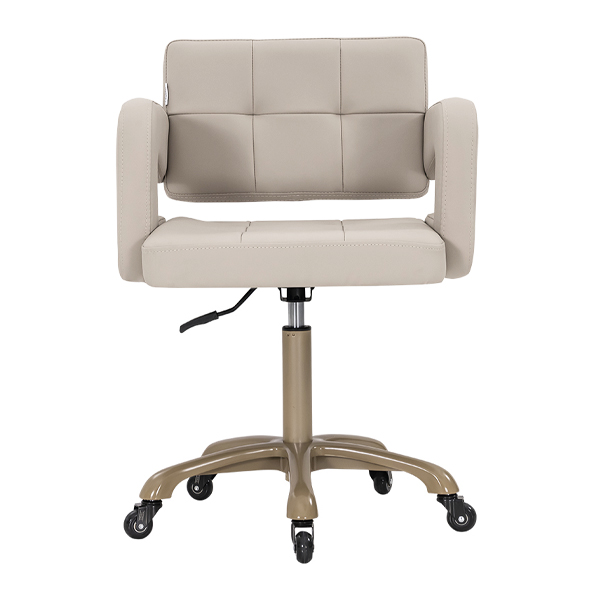 Glamourous beige gold frame and base. Back support to help in correct posture. Height adjustable. Padded memory foam. Professional 50mm roller wheels.